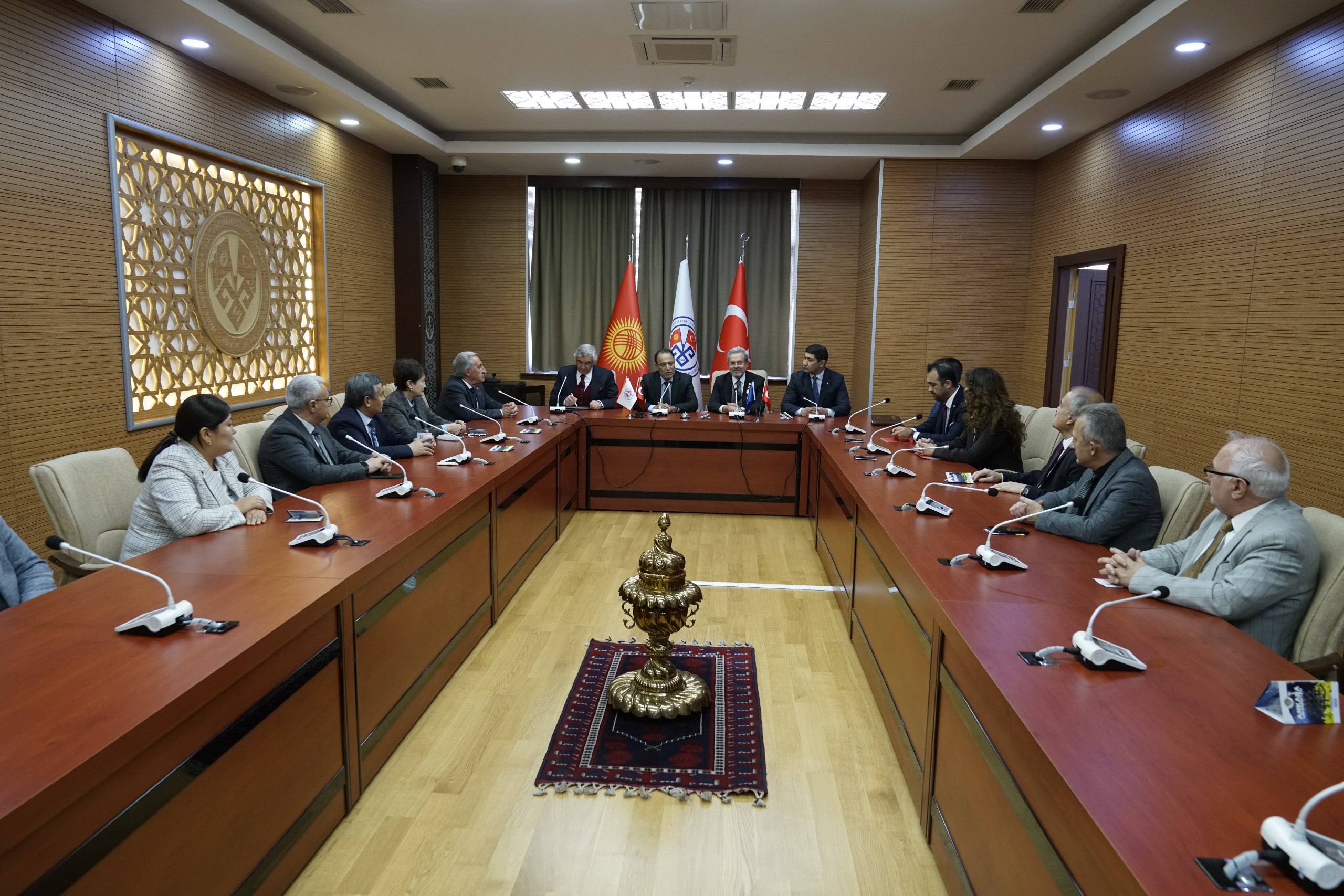 Ankara Üniversitesi heyeti, ziyaretin ilk gününde, KTMÜ Mütevelli Heyeti Başkanı Prof. Dr. İbrahim Çapak, Rektör Prof. Dr. Alpaslan Ceylan, Rektör Vekili Prof. Dr. Almaz İbrayev, rektör yardımcıları, genel sekreter ve senato üyeleri ile Senato Toplantı Salonu’nda bir araya geldi.